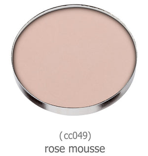 Rose mousse (cc049) corrector is used to correct greenish areas with a slight bluish tone on fair bases. typical usages are on fair/thin skinned individuals with greenish veins showing through in areas like the eyelid, temples, chest and back of the hands.