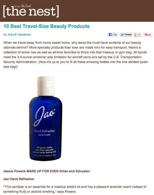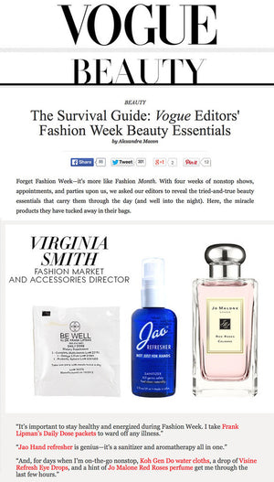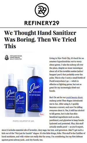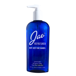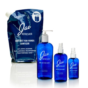 Jao Refresher™ 98.5% natural, multipurpose Jao Refresher™ is an instant disinfectant and aromatherapy boost in one. Kills germs and freshens hands with Ethyl Alcohol derived from grapes (less drying) and our very own blend of antiseptic essential oils: Lavender, Tea Tree, Eucalyptus, Geranium and Sage. We combine Chamomile and Calendula with natural cosmetic moisturizers so it will not dry out your hands. We do not use Triclosan or Bezalkonium Chloride, which are bad for the environment. Leaves skin feeling soft and refreshed - an effective hand sanitizer, instant skin cooler, body pick-me-up, rapid under-arm deodorant, zit zapper, after shave, and more!