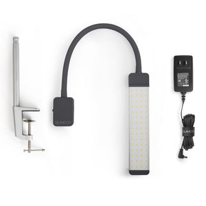 The MONO Light Kit includes the following: (1) Fully flexible single LED luminary with power and two setting dimming (1) Table clamp accessory (1) Dual voltage power supply (works in all countries)